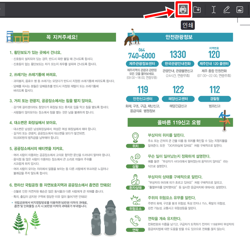 지도를 인쇄하고 싶다면 화면 상단에 있는 프린터 모양의 아이콘을 찾아보세요. 이걸 선택하면 바로 인쇄 절차를 진행할 수 있습니다. 지도와 함께 '꼭 지켜주세요!'와 같은 안전 여행 수칙과 관광안내, 긴급상황 시 필요한 연락처 정보도 함께 인쇄되니 여행 중 유용하게 활용할 수 있을 거예요.