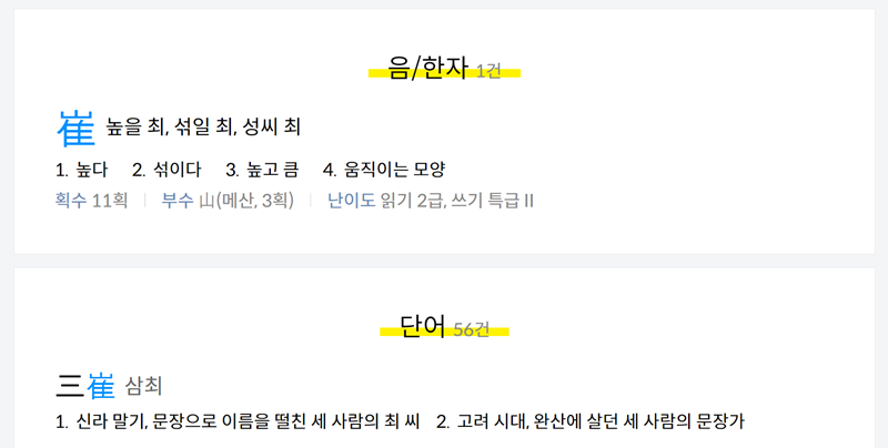 검색을 마치면 해당 한자에 대한 종합적인 정보가 나와요. 가장 위에서는 '음/한자' 항목을 통해 글자의 소리와 대표적인 뜻을 알 수 있고, 아래 '단어' 항목에서는 그 한자가 포함된 여러 단어까지 확인할 수 있어서 어휘력을 넓히는 데도 도움이 돼요.