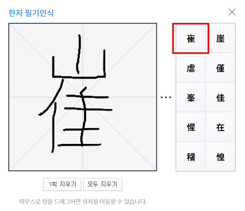 이제 마우스를 이용해서 찾으려는 한자를 한 획씩 정성껏 그려 넣습니다. 제가 그리는 모양을 인식해서 오른쪽에는 비슷한 형태의 한자들이 실시간으로 나타나요. 그 목록 중에서 내가 찾던 것과 정확히 일치하는 한자를 찾아 선택하면 됩니다. 삐뚤빼뚤 그려도 생각보다 잘 찾아줘서 신기했어요.