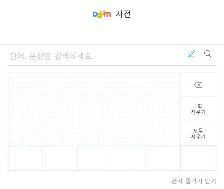 이 편리한 기능은 스마트폰에서도 사용할 수 있어요. 다음 사전 모바일 화면에서 검색창을 보면, 오른쪽 끝에 연필 모양의 아이콘이 보일 거예요. 이것이 바로 컴퓨터의 필기인식과 동일한 기능을 하는 모바일 필기 입력 도구랍니다. 이것을 눌러주세요.