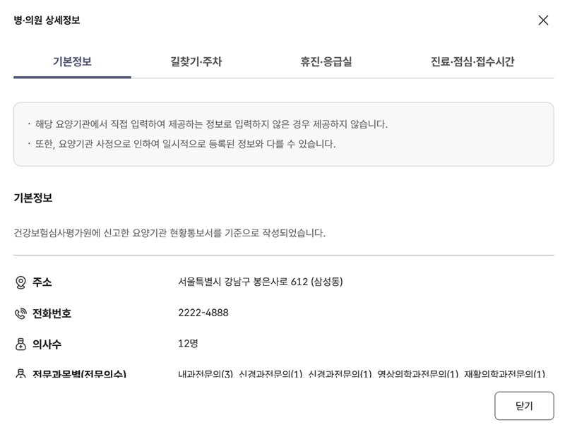 '상세보기'를 선택하면 해당 기관의 상세 정보를 확인할 수 있는 새 창이 나타납니다. 가장 먼저 보이는 '기본정보' 탭에서는 정확한 주소와 전화번호, 그리고 소속된 의사 수와 전문 과목 등의 내용을 상세하게 살펴볼 수 있어요. 방문하기 전에 미리 알아두면 유용한 정보들이니 꼼꼼히 확인해 보시는 것을 추천해 드려요.