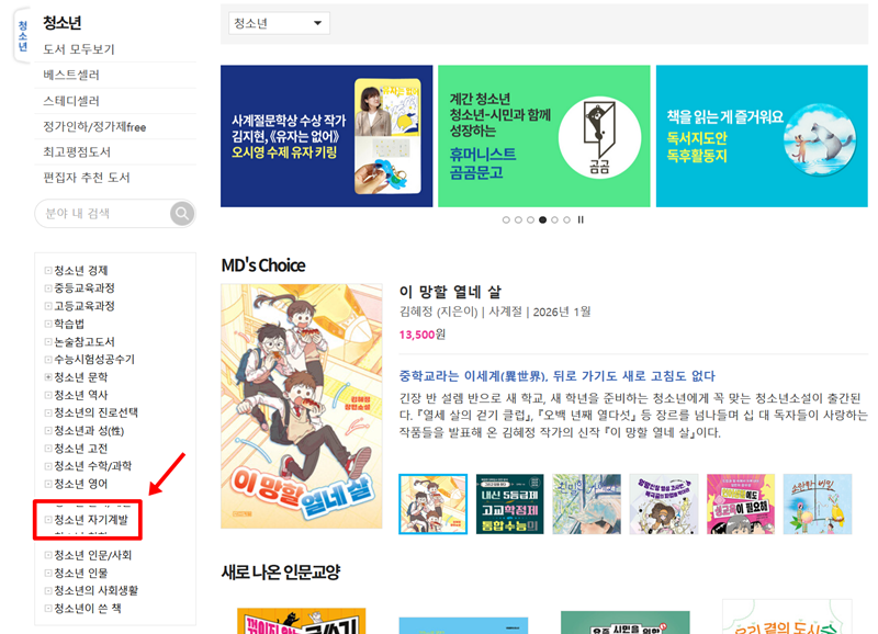 메뉴가 활짝 펼쳐지면 정말 다양한 갈래가 나오는데 당황하지 않고 천천히 살펴보면 답이 보여요. 국내도서 항목 중에서 우리 아이들에게 적합한 청소년이라는 글자를 찾아서 선택해 주었는데, 연령대에 맞는 유익한 내용들이 이곳에 다 모여 있는 것 같아 안심이 되었어요. 세분된 주제들이 일목요연하게 정리되어 있어서 길을 잃지 않고 원하는 방향으로 나아갈 수 있었답니다.
