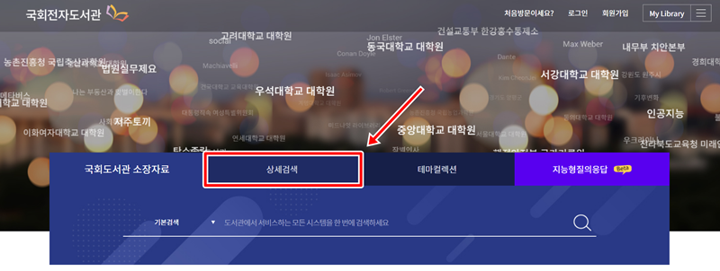 단순한 단어 검색만으로는 부족하다고 느껴질 때는 더 정교한 검색 방식이 필요해지는 시점이 와요. 그럴 때는 메인 화면에서 파란색 배경 위에 적힌 상세검색이라는 글자를 찾아서 가볍게 눌러주면 된답니다. 저도 처음에는 기본 검색만 썼지만 더 구체적인 조건이 필요할 때는 이 방식을 즐겨 찾고 있어요. 숨겨진 기능을 찾아내듯 이 부분을 선택하고 나면 내가 원하는 자료에 한 걸음 더 가까워지는 기분이 들어서 탐색하는 과정 자체가 하나의 즐거운 놀이처럼 느껴지기도 하더라고요.