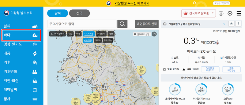 1. 기상청 날씨누리 홈페이지는 전국과 바다의 날씨 정보를 한눈에 볼 수 있는 공식 사이트예요. 실시간 기상 현황부터 주간 예보까지 다양한 정보를 제공해 여행이나 야외 활동을 계획하는 데 도움이 되죠. 바람, 파도, 기온 같은 해양 기상 정보도 확인할 수 있어요. 어디에서든 인터넷만 연결되면 쉽게 찾아볼 수 있고 모바일에서도 이용할 수 있어 편리하답니다. 바나 날씨 예보는 왼쪽 카테고리의 바다를 통해서 살펴볼 수 있어요.