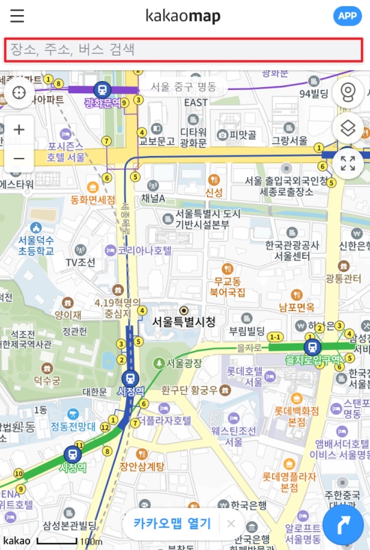 낯선 장소에 가야 할 때 저는 길을 찾기 위해 인터넷 검색창에 카카오맵을 입력하고 홈페이지로 들어가요. 홈페이지에 접속하니 현재 제 위치를 중심으로 한 지도가 나타나는데, 여기서 길찾기를 시작하기 위해 저는 가장 먼저 화면 상단에 있는 장소, 주소, 버스 검색이라고 표시된 검색창을 눌러줬습니다. 여기에 제가 가고 싶은 곳의 이름이나 주소를 입력하면 되더라고요.