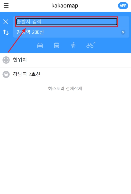 길찾기 버튼을 누르니 화면이 바뀌면서 제가 방금 선택한 강남역 2호선이 도착지로 자동 설정된 것을 볼 수 있었어요. 이제 어디서 출발할지를 정해야 해서, 도착지 바로 위에 있는 출발지 검색 입력 칸을 눌러 제가 출발하려는 장소의 이름을 입력해 주었습니다.