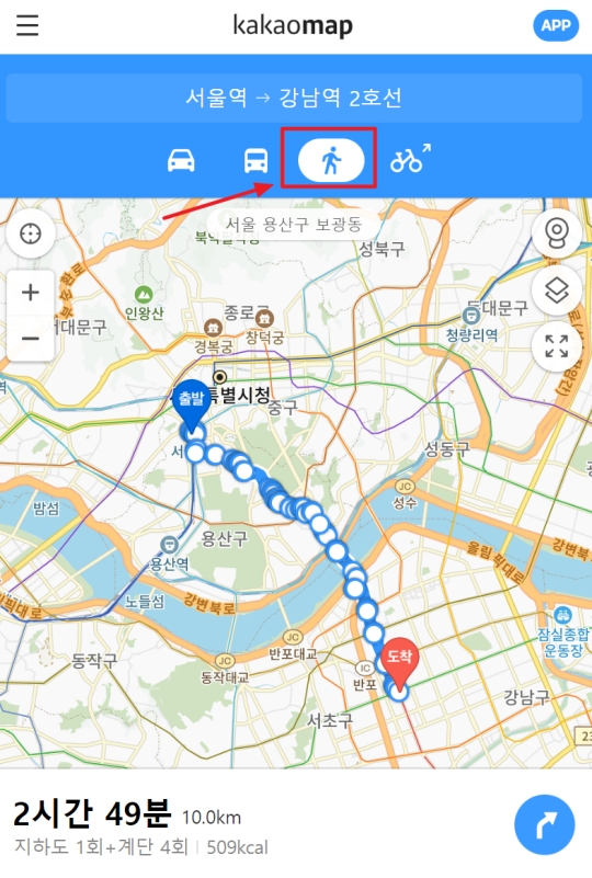 가끔은 시간 여유가 있거나 가까운 거리를 이동할 때 걸어가는 것도 좋더라고요. 그래서 사람 모양의 도보 아이콘을 선택해봤더니 출발지에서 도착지까지 걸어가는 길을 안내받을 수 있었습니다. 예상 소요 시간과 총 거리는 물론, 소모 칼로리 정보까지 알려주어 유용했어요.