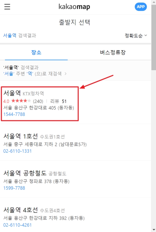 이번엔 출발지로 서울역을 검색해봤어요. 그랬더니 도착지를 검색했을 때와 마찬가지로 서울역과 관련된 여러 장소가 결과로 나왔습니다. KTX역, 1호선 등 다양한 선택지 중에서 저는 제가 출발하려는 정확한 곳인 서울역 KTX정차역을 선택했습니다. 정확한 출발지를 고르는 것이 중요하더라고요.