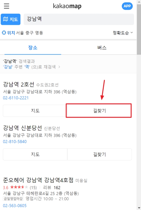 저는 예시로 목적지에 강남역을 검색해봤어요. 그러자 검색 결과에 강남역 2호선, 신분당선 등 관련된 여러 장소가 목록으로 나타났습니다. 이 중에서 제가 가고자 하는 정확한 목적지를 찾은 뒤, 그 항목 오른쪽에 있는 길찾기 버튼을 눌렀습니다. 이제 본격적인 경로 탐색을 시작할 수 있었어요.