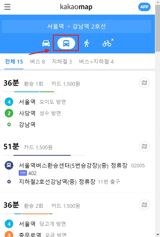 저는 자동차가 아닌 다른 교통수단이 궁금해서 상단의 아이콘을 바꿔봤어요. 버스 모양의 대중교통 아이콘을 누르니, 지하철이나 버스를 이용한 다양한 추천 경로가 나타났습니다. 각 경로마다 걸리는 시간, 환승 횟수 그리고 카드 요금까지 상세하게 알려주니 가장 좋은 방법을 쉽게 고를 수 있었어요.