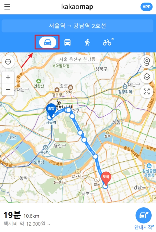 출발지와 도착지를 모두 입력하고 나니, 두 장소를 잇는 경로가 지도 위에 표시되었어요. 처음에는 기본적으로 자동차를 이용했을 때의 경로가 나타났습니다. 화면을 보니 예상 소요 시간과 총 거리가 표시되고, 아래쪽에서는 예상 택시비 정보까지 확인해 볼 수 있어서 이동 계획을 세우는 데 큰 도움이 됐어요.