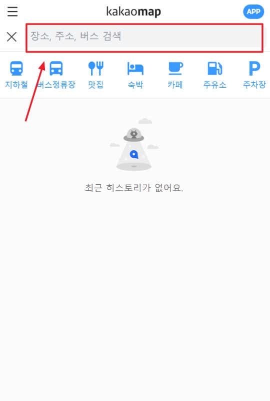 검색창을 누르니 최근 검색 기록이 없어서 최근 히스토리가 없어요라는 문구가 보였어요. 화면에는 지하철, 버스정류장, 맛집 등 여러 아이콘이 나타났는데, 저는 이런 분류를 통하기보다 상단의 검색창에 바로 목적지를 입력하는 게 더 편하더라고요. 그래서 원하는 목적지를 직접 입력해봤습니다.
