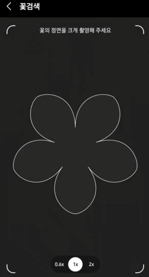 이제 화면이 카메라 모드로 바뀌면서 '꽃의 정면을 크게 촬영해 주세요'라는 안내 문구가 나타나요. 검은 화면 중앙에 꽃 모양의 하얀색 외곽선이 보이는데, 이 선은 촬영할 때 구도를 잡기 편하도록 도와주는 가이드라인이에요. 이 선에 맞춰서 꽃을 찍으면 인식률이 더 높아지더라고요. 꽃이 좀 멀리 있다면 아래쪽의 배율 버튼으로 화면을 확대할 수도 있어요.