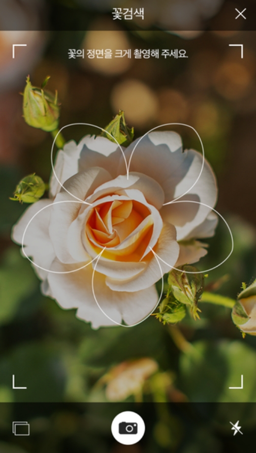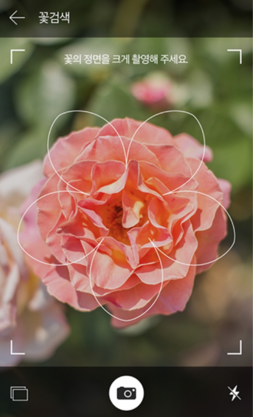 길에서 발견한 궁금했던 꽃에 카메라를 가까이 가져가 보세요. 화면에 투명한 꽃 모양 외곽선이 겹쳐 보일 텐데, 이 안에 꽃의 정면이 꽉 차도록 구도를 잡아주는 게 좋아요. 인공지능이 꽃잎의 모양이나 색깔, 수술 같은 특징을 가장 잘 파악할 수 있는 각도가 바로 정면이거든요. 화면 중앙에 꽃을 가득 채운다는 느낌으로 찍는 게 요령이에요.