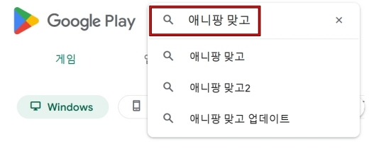 우선 핸드폰에서 게임을 받아야겠죠. 다들 익숙하실 구글 플레이 스토어 앱을 열어주세요. 맨 위에 보이는 검색창 부분에 '애니팡 맞고'라고 정확하게 입력한 다음 검색을 시작합니다. 저도 처음에 대충 쳤더니 다른 것들이 나와서, 정확한 이름을 쓰는 게 한번에 찾는 가장 빠른 길이더라고요.