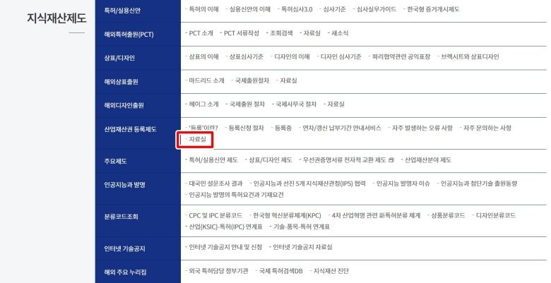 '지식재산제도'로 들어가면 또다시 세부 항목이 많이 나와서 복잡하게 느껴질 수 있어요. 여기서 우리가 필요한 서류는 등록과 관련된 것이기 때문에, 왼쪽에 있는 메뉴들 중에서 '산업재산권 등록제도'를 찾고 그 바로 아래에 있는 '자료실' 항목으로 들어가시면 돼요. 처음에는 저도 메뉴가 너무 많아서 한참 헤맸는데, 이렇게 목적을 생각하면서 찾으면 훨씬 수월하더라고요.