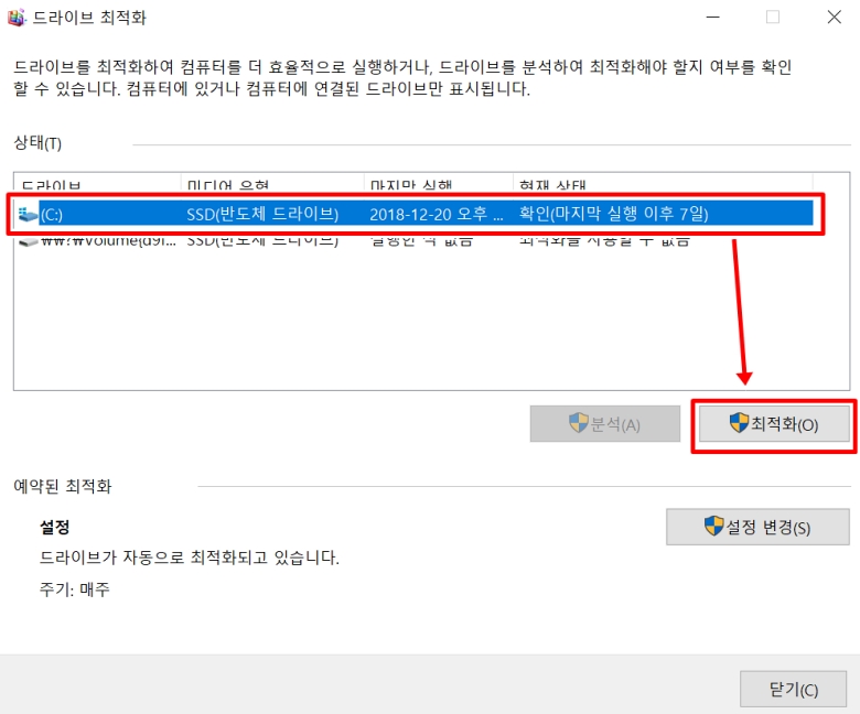 이제 '드라이브 최적화'라는 새 창이 뜰 거예요. 컴퓨터에 연결된 모든 드라이브 목록이 쭉 나오죠. 목록에서 방금 선택했던 C 드라이브를 찾아서 먼저 선택해 주세요. 제 컴퓨터는 SSD라서 '반도체 드라이브'라고 표시되네요. 드라이브를 선택한 상태에서 아래쪽에 있는 '최적화(O)' 버튼을 선택하면 바로 작업이 시작됩니다. SSD는 기존 하드디스크와 달라서 조각 모음 대신 '최적화'라는 작업을 하는데, 훨씬 빠르게 끝나요.