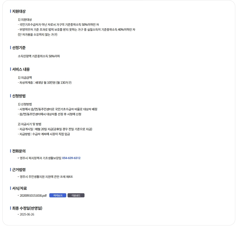 마지막으로 상세 내용을 확인하는 화면이에요. 누가 지원받을 수 있는지(지원대상), 어떤 기준으로 선정되는지(선정기준), 그리고 가장 중요한 신청 방법까지 자세하게 나와 있어요. 내용을 보니 거주지 읍/면/동 주민센터에 직접 방문해서 신청해야 하더라고요. 연락처도 있으니 미리 전화해보고 가는 것도 좋겠죠.