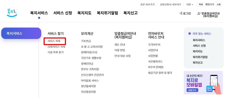 '복지서비스' 부분에 마우스를 올리면 아래로 작은 메뉴들이 더 나타나요. 여기서 두 번째에 있는 '서비스 목록'으로 들어가시면 돼요. 나라에서 지원하는 거의 모든 서비스가 여기에 다 모여있다고 생각하시면 편해요.