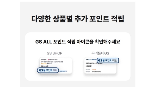 기본 적립 외에 추가로 포인트를 더 주는 상품이 있다고 했잖아요. GS SHOP이나 우리동네GS 앱에서 쇼핑하다 보면 상품 가격 아래에 파란색으로 'GS 올 포인트 적립'이라는 아이콘이 붙어 있는 경우가 있어요. 이런 상품을 구매하면 기본 적립보다 더 많은 포인트를 쌓을 수 있으니, 쇼핑할 때 한번씩 확인해 보면 좋아요.