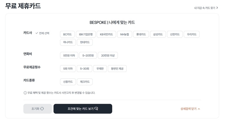 이제 나만의 조건을 설정해서 카드를 찾아볼 시간이에요. 저는 주로 쓰는 카드사를 먼저 정하고, 연회비는 가급적 저렴한 '5만원 이하'로 설정했어요. 이용 횟수나 카드 종류(신용/체크)까지 세세하게 고를 수 있어서 정말 편리하더라고요. 원하는 조건들을 모두 정했다면, 아래의 '조건에 맞는 카드 보기'를 선택해 주세요.