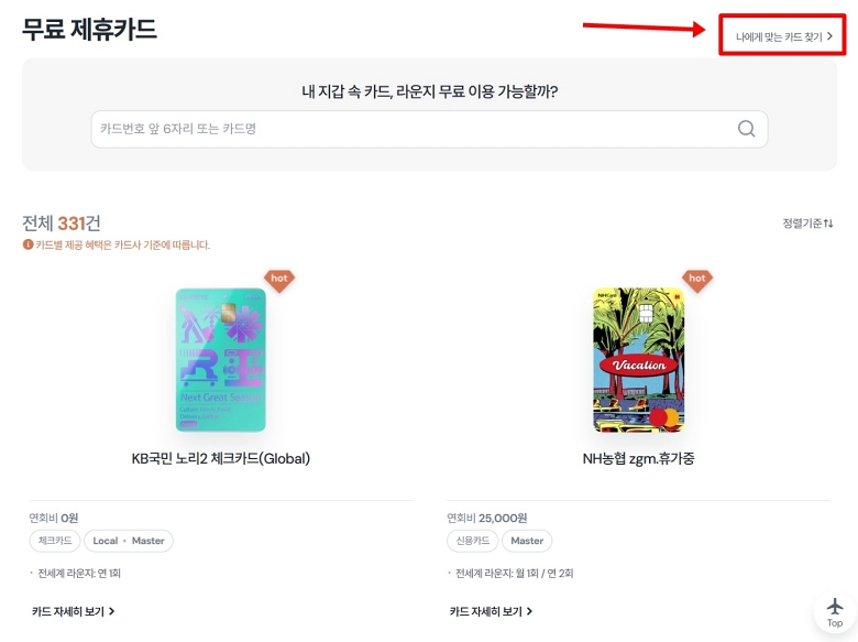 안으로 들어가면 정말 많은 카드가 나열되어 있어서 처음에는 조금 당황스러울 수 있어요. 저도 이걸 언제 다 보나 싶었거든요. 하지만 스크롤을 내리기 전에 화면 오른쪽 위를 한번 봐주세요. 작게 쓰인 '나에게 맞는 카드 찾기'라는 글자가 보일 거예요. 전체 목록을 다 훑어볼 필요 없이, 이 기능을 쓰면 시간을 훨씬 아낄 수 있더라고요.