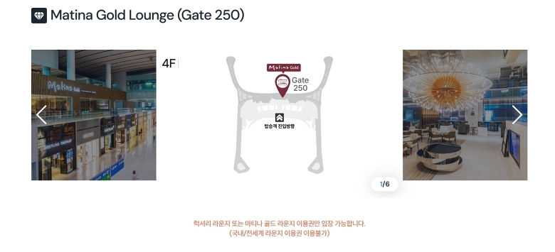 드디어 제가 이용할 수 있는 라운지 목록이 나왔네요. 예를 들어 '마티나 골드 라운지'의 경우, 터미널 몇 층 어디에 있는지 약도로 정확하게 보여줘서 찾아가기 정말 쉬워요. 라운지 내부 사진도 미리 볼 수 있고, 국제선 전용인지 국내선도 가능한지 같은 세부 정보도 적혀 있으니 헛걸음할 일이 없겠죠.