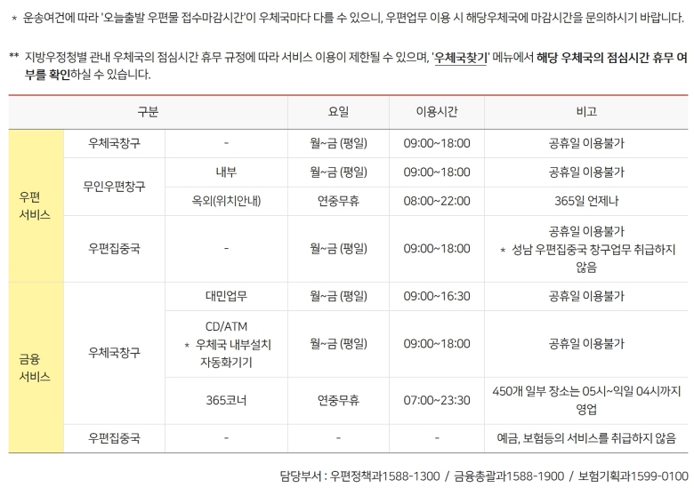 이곳에서 우체국의 서비스별 기본 운영 시간을 표로 한눈에 확인할 수 있어요. 우편 창구는 평일 9시부터 18시까지지만, 우리가 찾는 '금융 서비스' 항목의 '365코너'는 연중무휴로 오전 7시부터 밤 11시 30분까지 운영된다고 나와 있죠. 하지만 이건 기본적인 시간일 뿐, 지점마다 상황이 다를 수 있다는 안내 문구가 있으니 정확한 확인을 위해 한 번 더 확인하는 과정이 필요해요.