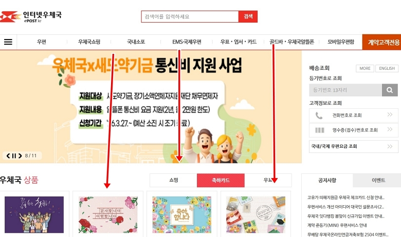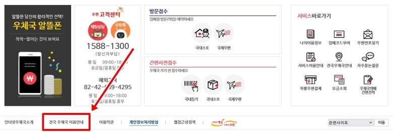 정확한 정보를 확인하기 위해 저는 먼저 인터넷우체국 사이트를 찾아 들어가요. 홈페이지에 들어가면 상단에 우편, 금융 등 여러 메뉴가 복잡하게 보일 수 있는데요. 제가 찾는 정보는 보통 메인 화면 아래쪽에 있더라고요. 그래서 저는 보통 다른 메뉴를 둘러보지 않고 곧장 화면을 맨 아래로 쭉 내려요.