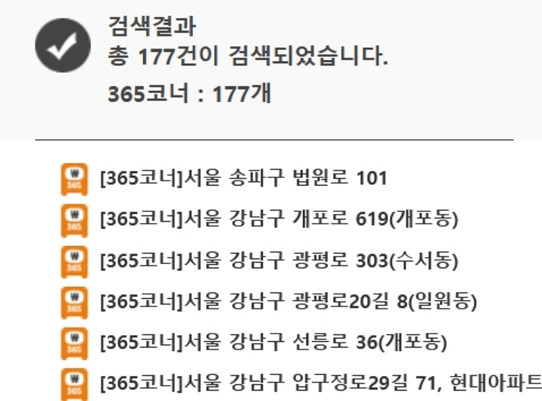 검색을 마치면 제가 설정한 지역에 있는 365코너의 목록이 주소와 함께 쭉 나타나요. 제 경우에는 서울에 총 177개의 365코너가 검색되었네요. 이 목록에서 제가 방문하려는 곳과 가장 가까운 위치의 우체국을 찾으면 돼요. 주소가 명확하게 나와 있어서 찾기 어렵지 않았어요.