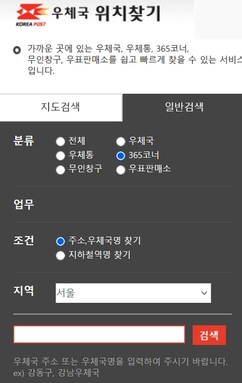 개별 지점의 시간을 확인하기 위해 저는 '우체국찾기' 기능을 이용해요. 다시 안내 메뉴로 돌아가 '우체국/우체통 찾기'로 들어간 뒤, 검색 화면에서 분류를 '365코너'로 설정해요. 그리고 지역을 제가 사는 '서울'로 선택하고 검색하면, 해당 지역에 있는 모든 365코너를 찾아주기 때문에 훨씬 정확한 정보를 얻을 수 있어요.