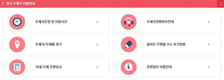 '전국 우체국 이용안내'로 들어가면 팝업창 형태로 여러 가지 서비스 안내 항목이 나타나요. 우편물 주소 표기 방법, 전화번호 안내 등 다양한 정보가 있는데, 여기서 우리는 맨 위 왼쪽에 시계 아이콘과 함께 있는 '우체국운영 및 이용시간' 항목으로 들어가면 됩니다.