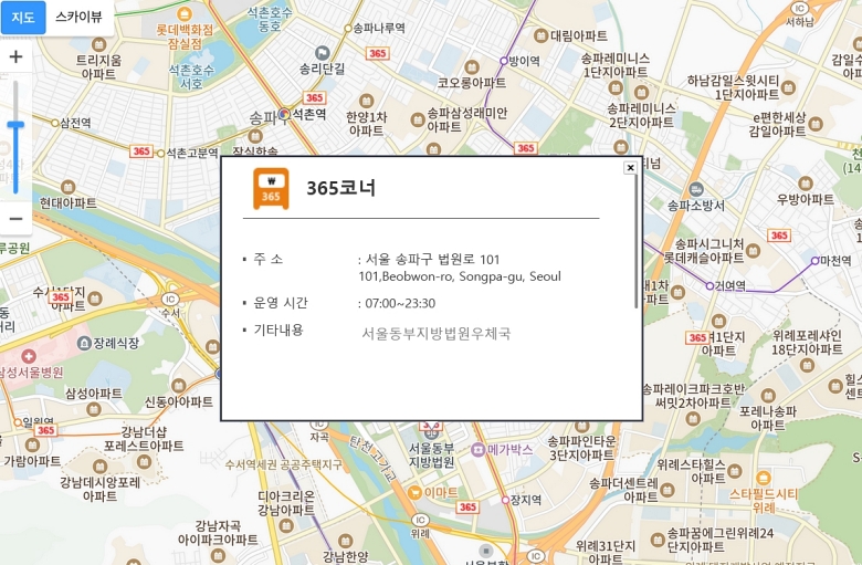 목록에서 제가 가려는 지점을 선택하면, 지도에 정확한 위치가 표시되고 옆에 상세 정보창이 떠요. 이 정보창 안에 제가 최종적으로 확인하고 싶었던 해당 지점의 '운영 시간'이 정확하게 나와 있어요. 이렇게 확인하고 가면 이제 헛걸음할 걱정 없이 안심하고 방문할 수 있겠죠.