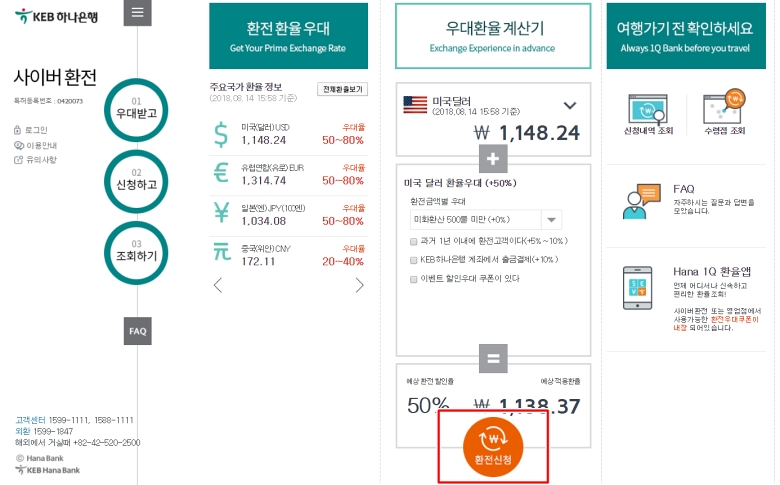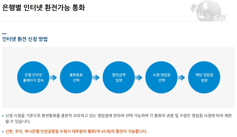 '인터넷환전 안내'로 들어가면, 먼저 온라인으로 환전을 신청하는 일반적인 절차가 그림으로 간단하게 설명되어 있어요. 보통 은행 홈페이지에 접속해서 원하는 통화와 금액을 입력하고, 돈을 받을 지점을 선택한 뒤, 정해진 날짜에 방문해서 수령하는 순서로 진행돼요. 전체적인 흐름을 미리 파악해두면 나중에 실제로 신청할 때 덜 헷갈리겠죠?