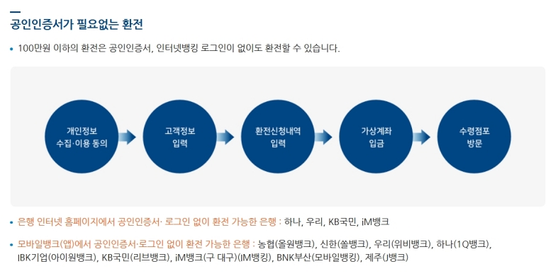 요즘은 복잡한 공인인증서가 없어도 환전할 수 있어서 정말 편해졌어요. 보통 100만 원 이하의 소액은 별도의 로그인이나 인증 절차 없이, 개인정보와 환전 내역만 입력하고 가상계좌로 입금하면 신청이 완료되는 경우가 많아요. 하나은행, 우리은행, KB국민은행 등이 이런 간편 서비스를 제공하고 있으니 참고하시면 좋을 것 같아요.