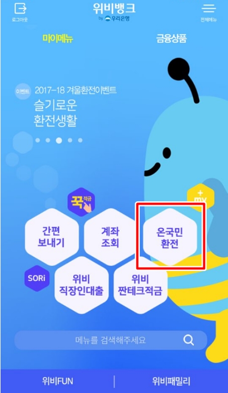 우리은행은 '위비뱅크'라는 앱을 사용하면 간편하게 처리할 수 있어요. 앱의 메인 화면을 보면 여러 가지 서비스 아이콘이 모여 있는데, 그중에서 꿀벌 캐릭터와 함께 보이는 '온국민 환전' 메뉴를 선택해서 들어가시면 됩니다. 이름처럼 누구나 쉽게 이용할 수 있도록 만들어 둔 것 같아요.