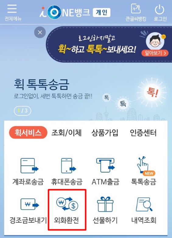 마지막으로 IBK기업은행의 'i-ONE뱅크' 앱이에요. 이 앱은 로그인하지 않은 첫 화면에서도 바로 서비스를 이용할 수 있다는 장점이 있어요. 여러 서비스 아이콘 중에서 원화(₩)와 달러($) 표시가 같이 있는 '외화환전' 메뉴를 선택하면, 로그인 없이도 바로 환전 신청 절차를 시작할 수 있습니다.