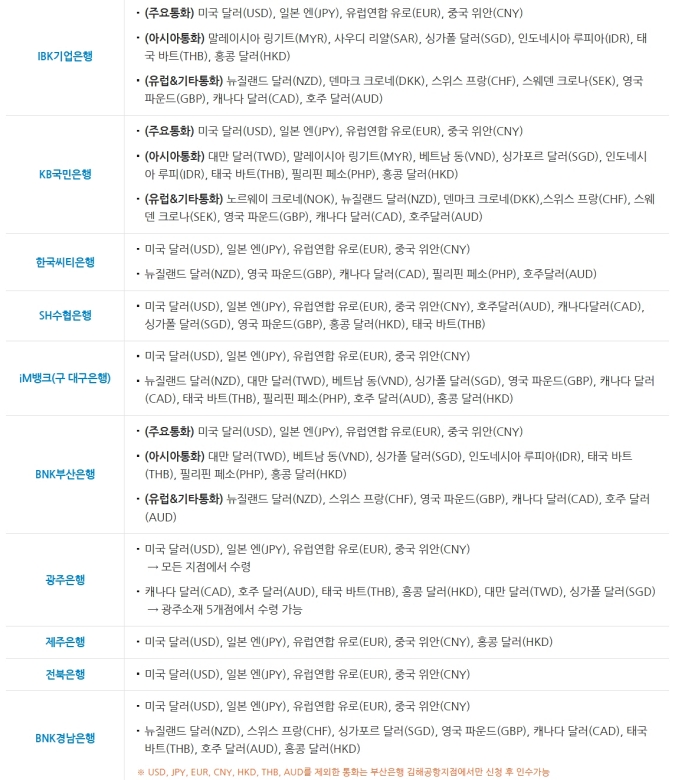 이어서 다른 은행들의 정보도 쭉 나오니, 본인이 주로 이용하는 은행이 있는지 확인해 보세요. KB국민은행이나 IBK기업은행 역시 미국 달러, 일본 엔 같은 주요 통화는 물론 베트남 동, 싱가포르 달러 등 다양한 통화를 온라인으로 신청할 수 있어요. 여기서 본인이 바꾸고 싶은 통화를 취급하는 은행을 미리 확인해두면 여러 은행 사이트를 헤맬 필요가 없어서 정말 편해요.