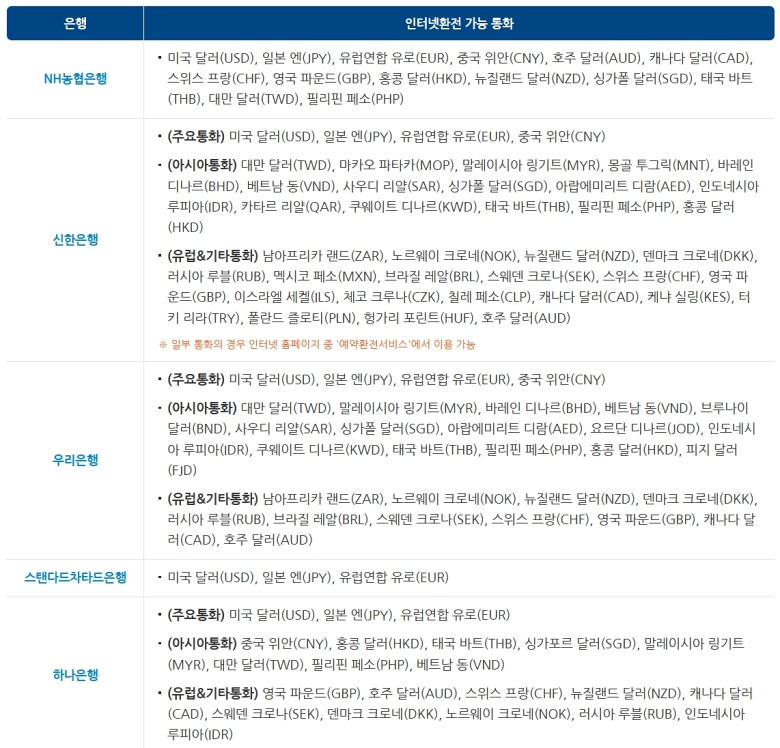 이제 스크롤을 조금 내려보면, 각 은행별로 인터넷에서 환전이 가능한 통화 목록이 자세하게 나와요. 예를 들어, NH농협은행은 미국 달러, 일본 엔, 유로 같은 주요 통화는 물론이고 태국 바트나 필리핀 페소까지 취급하는 걸 볼 수 있어요. 신한은행의 경우 더 다양한 아시아권 통화와 유럽, 기타 지역 통화까지 폭넓게 다루고 있어서 선택의 폭이 넓더라고요.