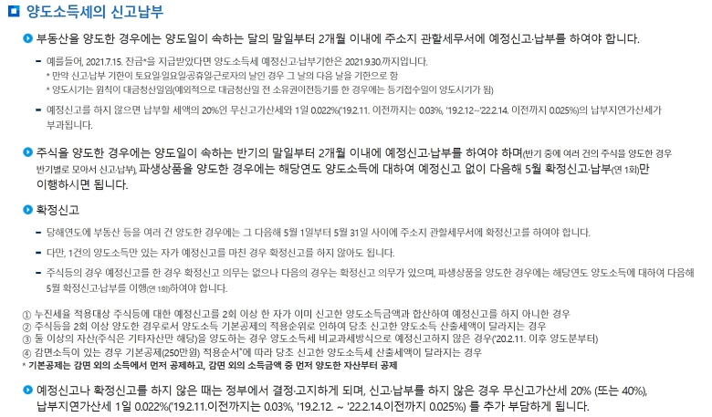 양도소득세는 신고하고 납부하는 기간이 정해져 있어요. 부동산을 판 경우에는 양도일이 속하는 달의 말일부터 2개월 이내에 예정신고를 해야 해요. 만약 예정신고를 하지 않으면 가산세가 붙을 수 있으니 주의해야 해요. 비과세 대상이라도 내용을 정확히 알고 있는 것과 모르는 것은 큰 차이가 있으니, 신고 기간도 참고로 알아두시면 좋겠어요.