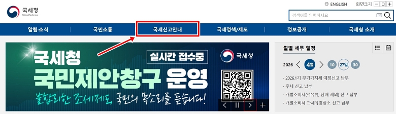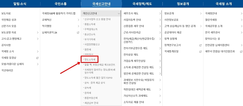 양도세에 대한 정확한 정보를 확인하려면 역시 국세청 사이트를 이용하는 게 가장 좋아요. 국세청 홈페이지에 들어가신 뒤, 상단 메뉴에서 '국세신고안내' 항목을 찾아 선택해주세요. 여러 세금에 대한 정보가 모여 있는 곳이라, 여기서부터 시작하면 된답니다.