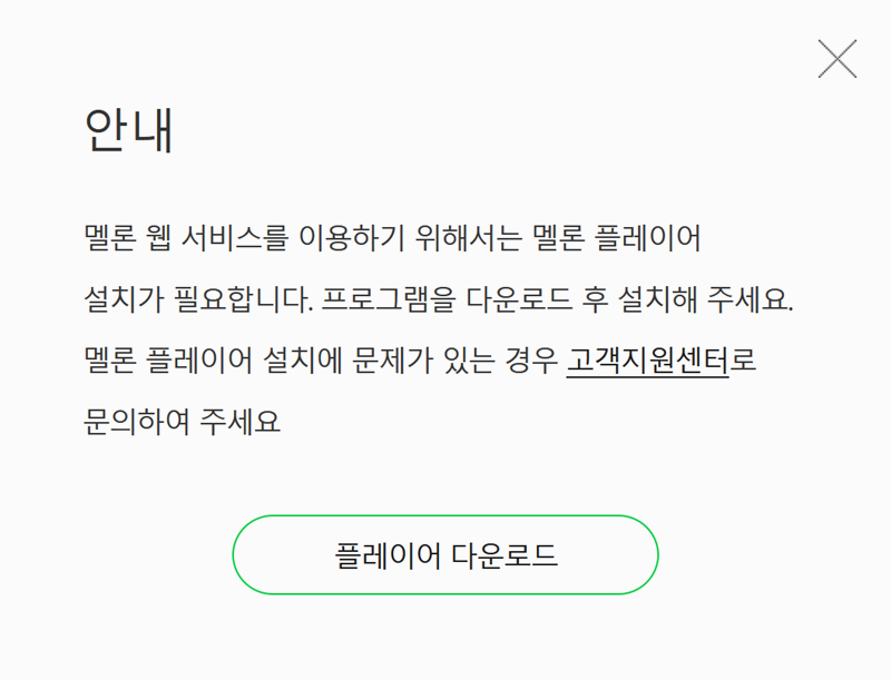 5. 다만 노래나 가사를 누르면 멜론 플레이어가 열리는데 웹에서 멜론 서비스를 이용하려면 멜론 플레이어를 설치해야 해요. 무료로 설치 할 수있어요. 만약 음악을 재생하려고 했는데 설치 안내 창이 뜬다면 하단에 있는 플레이어 다운로드 버튼을 눌러 프로그램을 설치하면 돼요. 설치 과정에서 문제가 발생하면 고객지원센터를 통해 도움을 받을 수 있어요.