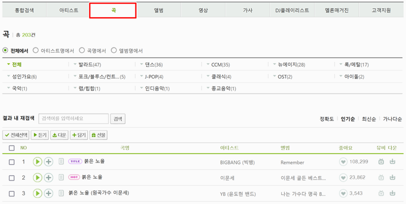 3. 검색 결과에서 곡을 선택하면 노래 제목을 찾을 수 있어요. 같은 제목이라도 가수나 앨범이 다를 수 있으니 원하는 곡이 맞는지 확인해 보세요. 인기순이나 최신순으로 정렬할 수도 있어서 편리해요. 여러 곡이 나올 경우 원곡이나 리메이크 버전을 비교해 보는 것도 좋아요.