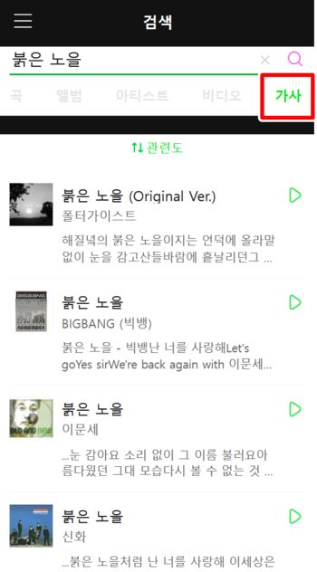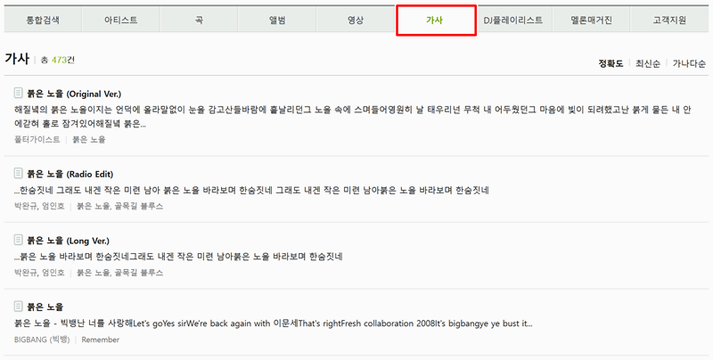 8. 가사를 선택하면 해당 곡들의 가사가 표시되며 관련도가 높은 순서대로 정렬돼요. 원하는 노래의 가사를 빠르게 찾아볼 수 있어 유용하게 활용할 수 있답니다.
