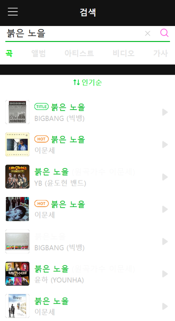 7. 모바일에서도 이렇게 검색하면 노래 제목을 인기순으로 쉽게 확인할 수 있어요. 또한 곡, 앨범, 아티스트, 비디오, 가사 등 원하는 카테고리를 선택해 더욱 정확한 검색 결과를 볼 수 있답니다.