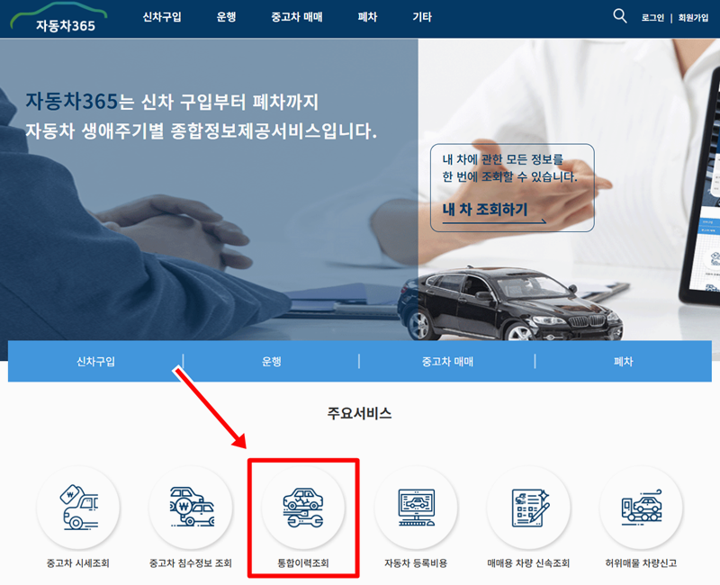 2. 자동차 365 홈페이지는 자동차와 관련된 다양한 정보를 한곳에서 쉽게 찾아볼 수 있는 곳이에요. 차량 등록부터 검사 일정 조회, 중고차 거래 정보까지 제공하며 운전자에게 꼭 필요한 서비스들을 편리하게 이용할 수 있도록 도와줘요. 주요 서비스에서 ‘통합이력조회’를 누릅니다.