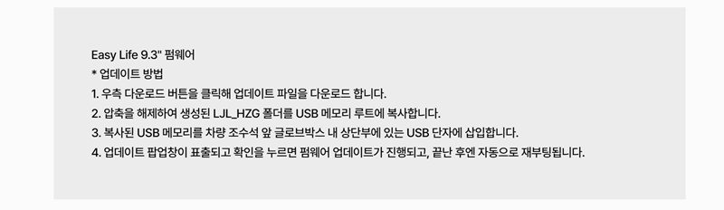 7. 내려받은 파일은 압축을 풀고 생성된 폴더를 USB 메모리에 복사해야 합니다. 이후 USB를 자동차의 USB 포트에 꽂으면 자동으로 업데이트가 진행됩니다.
