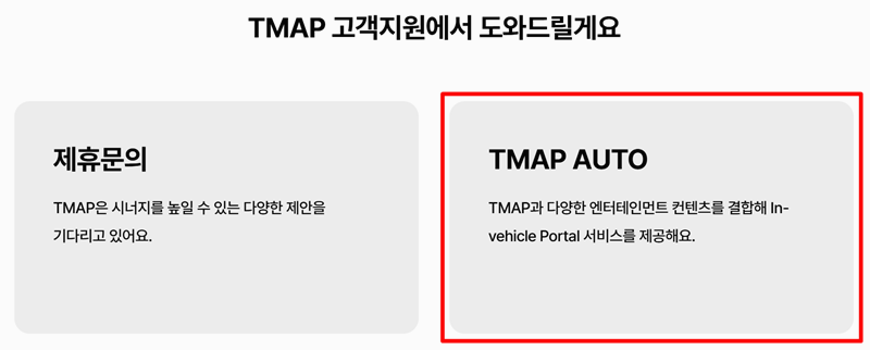 2. 고객지원 메뉴에 들어가면 TMAP AUTO 카테고리를 선택해야 합니다. 이곳에서는 차량과 연동되는 내비게이션 업데이트를 진행할 수 있으며 필요한 파일과 설치 방법도 확인할 수 있습니다.
