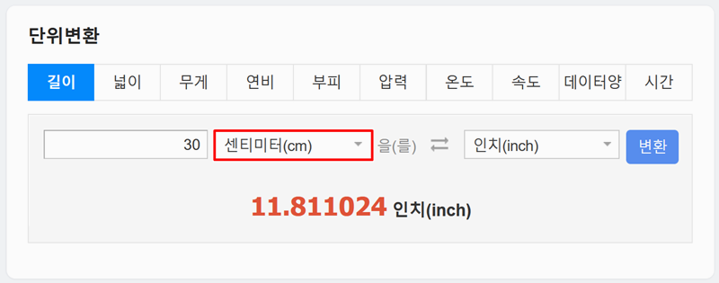 3. 반대로 센티미터에서 인치로 변환하는 것도 가능합니다. 이번에는 왼쪽에 센티미터를 선택하고 오른쪽에 인치를 선택 한 후 변환을 눌러서 인치를 확인해보세요.