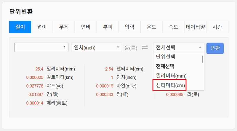 4. 이용을 하면서 보니 오른쪽에 선택을 하지 않고 바로 변환을 눌러도 센티미터를 확인 할 수 있고 이외에도 밀리미터, 미터, 킬로미터, 피트 등의 단위를 한눈에 알아볼 수 있었어요.